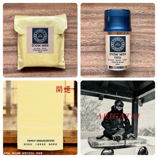 snow wax , snow wax easy の特別セットです FAMILY SNOWSURFERS は皆様のおかげで開業三年が無事に経ちました。とても有難い記念に開運お守りタオルがオマケについた少しお得なセットをご用意いたしました。企画第一弾はシリコン調合魔術師の魂がこもった FAMILY SNOWSURFERS 最初のオリジナルワックス snow wax と、リキッドのシリコン配合ワックス easy のセットです。 開運! 黄金に輝くワックスとタオル!(イエローですけど) きっと良い雪、良い温泉に巡り会えることでしょう! 皆様の健康と安全を願いましてお届けいたします♡ 是非この機会にお試しいただけましたら幸いです snow wax 150g snow wax easy 100ml オマケ 非売品 開運お守りタオル 日本製 温泉仕様200匁 ※ 発送は2月9日以降を予定しています